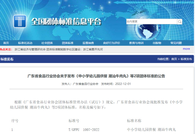 2022年12月01日,由廣東揚航食品股份有限公司參與制定的廣東省食品行業協會團體標準《中小學幼兒園供餐 潮汕牛肉丸》正式通過全國團體標準信息平臺審核。此標準的制定填補了國內及行業的空白,解決了潮汕牛肉丸進入中小幼兒園供餐潮汕牛肉丸無標準可依的問題。